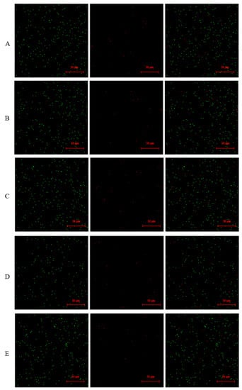 The SYTO 9 was combined with PI stains to be used to distinguish live and dead LAB in the yogurt. Figure 7 was a photo taken by a laser confocal microscope, and we could clearly see that the proportion of green dots in the field of view was very large, but the proportion of red dots was the opposite. After counting the number of green and red spots in the field of view, the proportions of live bacteria could be concluded from Figure 7A–E were 92%, 94.31%, 90.4%, 91.3%, and 93.4%, respectively.