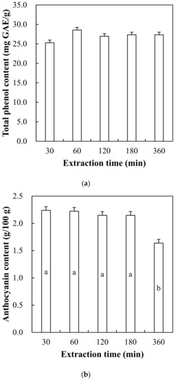 Total phenol content (a) and anthocyanin content (b) of red maple leaf extracts through hot water extraction (60 °C) for 30, 60, 120, 180, and 360 min. Error bars represent standard error of the means. a,b Means with the same letter are not significantly different (p ≥ 0.05).