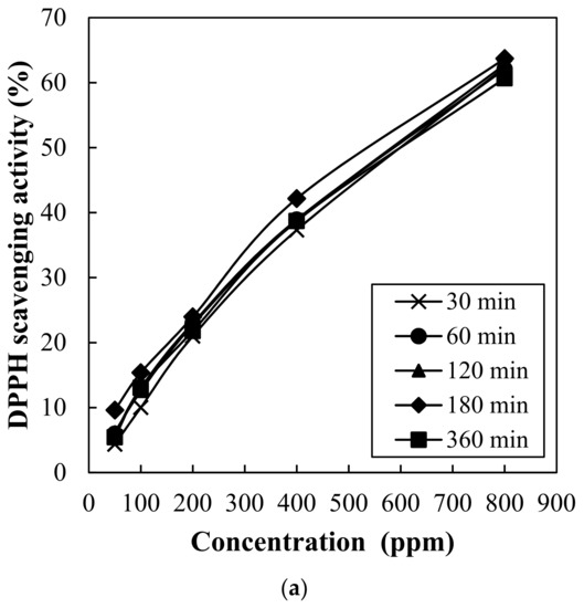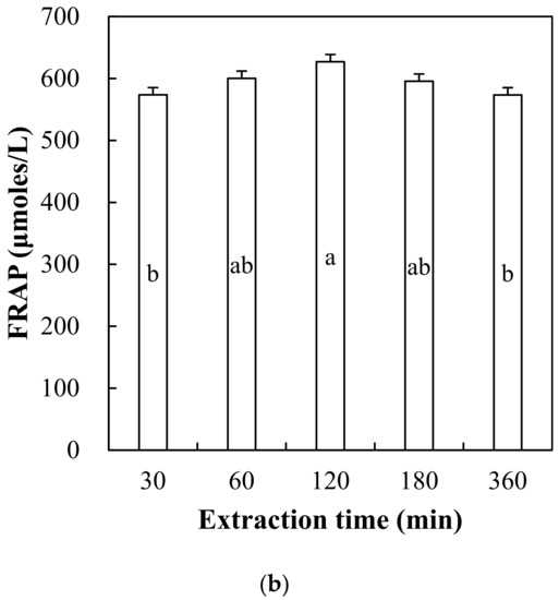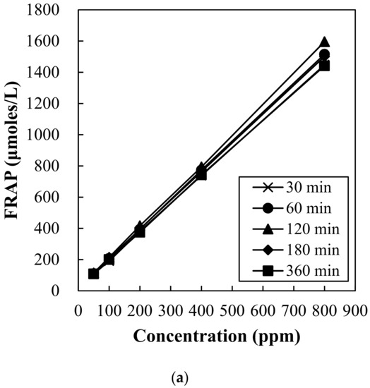 Antioxidant capacity of red maple leaf extract was determined through DPPH radical scavenging activity (Figure 2) and ferric reducing antioxidant powder (FRAP) assay (Figure 3). DPPH radical scavenging activity of red maple leaf extracts showed concentration-dependent manner (Figure 2a), but no significant interaction between extraction time and concentration was observed. As a result, the red maple leaf extracts presented similar 50% radical scavenging activity (IC50) value as follows (p > 0.05); 30 min (611 ppm), 60 min (603 ppm), 120 min (599 ppm), 180 min (576 ppm), and 360 min (617 ppm). Ferric reducing antioxidant power (FRAP) of red maple leaf extracts with different extraction time is shown in Figure 3. An increase in extraction time by 120 min increased FRAP value of red maple leaf extract, but the FRAP value decreased after 180 min of extraction time. The extraction time of 120 min caused significantly higher FRAP value compared to extraction for 30 min or 360 min (Figure 3b). In general, the amount of polyphenolic compounds is highly correlated with antioxidant capacity, thus, many previous studies have found that extraction of a large amount of polyphenol can be expected to produce an extract with excellent antioxidant activity. In this study, hot water extraction for 360 min had no impact on polyphenol content as well as DPPH radical scavenging activity of red maple leaf extract. However, the decreased FRAP value over 120 min might be associated with partial thermal-degradation of heat-sensitive polyphenolic compounds including anthocyanins. Considering the antioxidant content and activity contained in the maple leaf extract, thus, the most appropriate hot water extraction time at 60 °C may be 120 min.