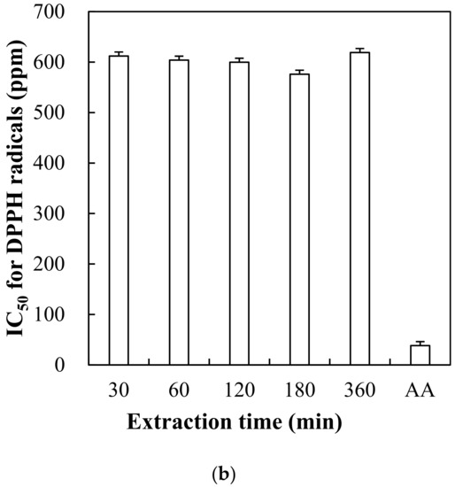 Change in DPPH radical scavenging activity at different concentrations (a) and IC50 values for DPPH radicals (b) of red maple leaf extracts through hot water extraction (60 °C) for 30, 60, 120, 180, and 360 min. AA, L-ascorbic acid (as control). Error bars represent standard error of the means.