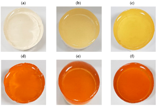 Exterior photos of 6%, 18%, and 30% gelatin gels formulated with 1000 mg/L of red maple leaf extract are shown in Figure 4. At 6% concentration (Figure 4a), the gelatin gel showed typical translucent phase, but the addition of 1000 mg/L of red maple leaf extract caused a distinct orange color (Figure 4d). An increase in gelatin concentration caused the formation of a yellowish gel visually, but between the extract treatments (Figure 4d–f), no difference in the color properties was observed with the naked eye regardless of gelatin concentration.