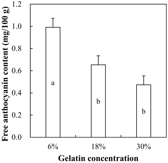 Free anthocyanin content of 6%, 18%, and 30% gelatin gels formulated with 1000 mg/L of red maple leaf extract is shown in Figure 5. Free anthocyanin content of gelatin gels was significantly affected by gelatin concentration. The 18% and 30% gelatin gels showed lower free anthocyanin content compared to 6% gelatin gel (p < 0.05), although the same amount of red maple leaf extract was added. Free anthocyanin content refers to the amount of anthocyanins that can be easily released during digestion, thus, low release amount can indicate the minimal level of diffusive release of anthocyanins [34]. Previously, Betz and Kulozik [34] have found that an increase in protein level (15%, 20%, and 25%) is why protein gels with bilberry extract did not affect the release rate of anthocyanins. When considering the fact that gelatin can form more intensive gel structure compared to other food proteins at the same protein level [25], our results in this current study show that an increase in gelatin concentration can delay the release of anthocyanins, and suggest that this phenomenon might be associated with a barrier effect of gelatin structure and/or an interaction between the gelatin and anthocyanin molecules.