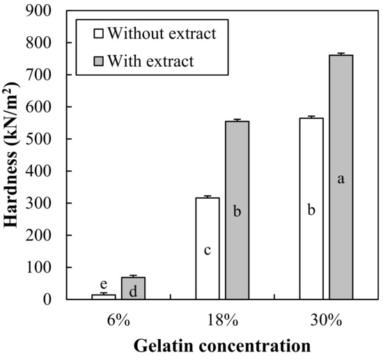Hardness of 6%, 18%, and 30% gelatin gels formulated with 1000 mg/L of red maple leaf extract is shown in Figure 6. There was a significant interaction between gelatin concentration and extract addition on hardness of gelatin gels. As expected, an increase in gelatin concentration significantly increased the hardness of gelatin gels. Moreover, at the same gelatin concentration, the addition of red maple leaf extract considerably increased the hardness of gelatin gels (p < 0.05). Similarly, Tongmai et al. [35] have reported that addition of 13–26% Thai mulberry increased the hardness of gelatin gel. Hwang and Thi [36] have also found that an increase in aronia extract increased the hardness of gelatin gels, and suggest that the pH change due to organic acid contained in aronia extract and/or saccharides could increase the hardness of gelatin gels. As well, it has been suggested that saccharides in aronia extract could be gelated through thermal processing, which would be one of reasons for the increased hardness of gelatin gels with aronia extract [33]. In this study, the pH of red maple leaf extract was around 3.0, which might contribute to the increased hardness of gelatin gels. Moreover, red maple leaves contain about 8% carbohydrates, of which sugar accounts for about 2% [25]. Thus, the acidic pH and saccharides in red maple leaf extract might be major factor increase the hardness of gelatin gels, which were also agreement with the suggestion of Hwang and Thi [36].