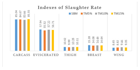 The slaughter rate is one of many factors affecting the value of a slaughter animal. The indexes of slaughter rate are presented in Figure 1 and were calculated by dividing the weight of carcass by live weight and multiply by 100. The carcass rate was higher in the TM15 group followed by control group (SBM). There were slight variations in the percentages of other meat potions.