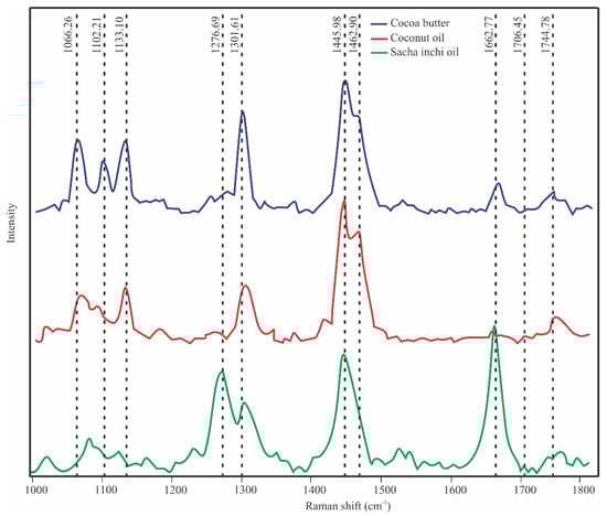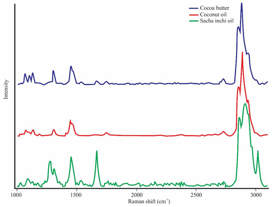 In the olefinic band in the C=C stretching range (1200–1800 cm−1), Bresson et al. [34] attributed the liquid form of CB to the intensity of the peak located at ~1661 cm−1, as well as to the functional group present in oleic acid. That is, the higher intensity of this peak characterizes the liquid state of CB, and the lower intensity characterizes the solid state (form IV). This coincides with what is observed in Figure 2a,c, in which this peak is located at 1662.7 cm−1 in CB, CNO, and SIO. There is a noticeable difference in the intensity of this peak, since it is higher in the SIO, which determines its liquid state at room temperature and its proportion of oleic acid. Likewise, this peak was observed at 1658 cm−1 by De Géa Neves et al. [18] in the Raman spectrum of CNO and was used as a differentiating pattern between CNO and other vegetable oils. The peak at 1445 cm−1 is related to the C–H deformation vibration, and the peak at 1658 cm−1 is assigned to cis C=C bonds, both of which provide the degree of unsaturation value [35,37]. Therefore, these peaks can be useful to determine the degree of unsaturation of CB, CNO, and SIO.