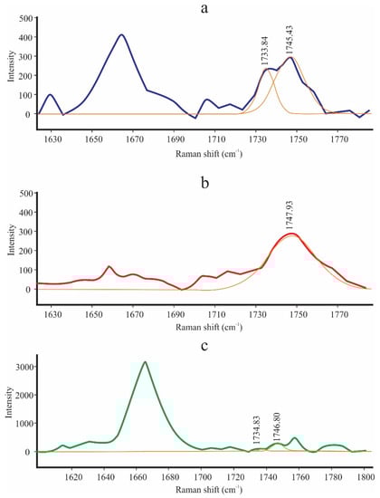 Carbonyl stretching region (1700–1780 cm−1) of CB and vegetable oils: (a) CB; (b) CNO; and (c) SIO.