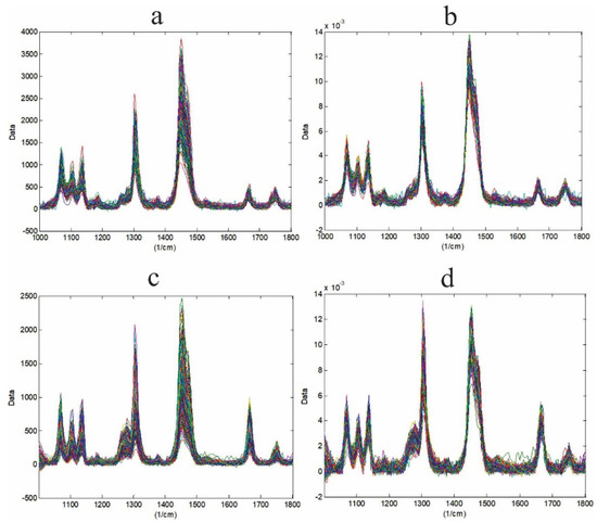 Raw data (a,c) and preprocessed data (b,d) from CB samples mixed with 25% CNO (a,b) and 25% SIO (c,d).