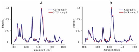 Zhang et al. [40] worked with white chocolates, making a comparison between the spectrum of the pure components such as sucrose, lactose, butter and whey. The correlation coefficients between the pure spectra and those recovered by MCR–ALS with data preprocessing were between 0.6701 and 0.9910, which were considered satisfactory. The equality constraint fixes the recovered spectra or concentrations to specific known values [43]. This is the reason why the values of the correlation coefficient between the recovered spectra and the pure compounds are high (Table 4). Additionally, Figure 5 shows that there is no rotational ambiguity, because the recovered spectra () are identical to the original spectra. The same results were obtained for the other samples. Based on these results, we can affirm that the first spectrum recovered by MCR–ALS (component 1) corresponds to CB, while the second spectrum (component 2) corresponds to vegetable oil, according to the sample analyzed.