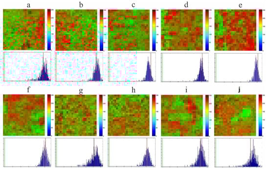 Figure 6 shows the distribution maps and their corresponding histograms. These maps are constructed by the MCR–ALS model from the concentration matrix and show the distribution of the compounds in the blend. The reddest areas correspond to higher concentrations and the greenest areas correspond to the lowest concentrations. We can note that, in general, the histograms corresponding to the distribution maps are peak-shaped and symmetric, which indicates that both the CNO (Figure 5a–e) and the SIO (Figure 5f–j) form a homogeneous blend with the CB. However, there are differences in the shapes between each histogram caused by the different concentrations of vegetable oil used in each sample.