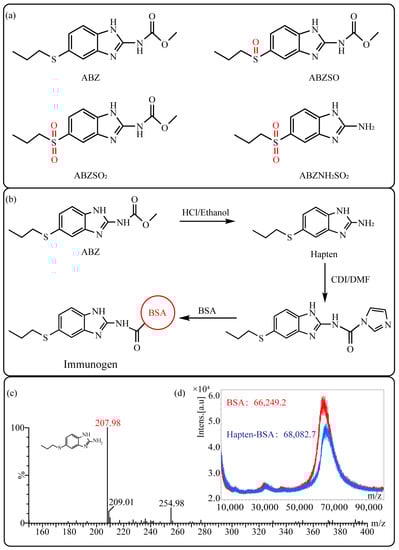 Chemical structures and synthesis route used in the study: (a) Chemical structure of four ABZs. (b) Synthesis route of hapten and immunogen. (c) Mass spectrometry characterization of hapten and (d) Matrix-assisted laser desorption/ionization time-of-flight mass spectrometry characterization of hapten- bovine serum albumin (BSA) conjugates.