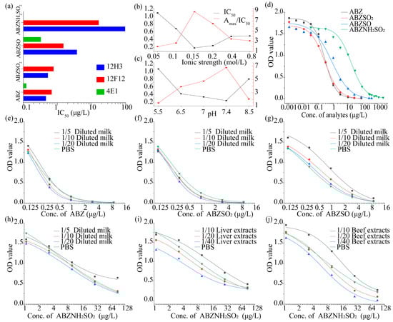Optimization of ic-ELISA. The IC50 was calculated when the Amax (Optical density (OD) value of negative control) ranged from 1.0 to 2.0. (a) Screening of Mab. Each Mab was estimated using four ABZs separately. The effect of (b) pH value and (c) ionic strength in the ic-ELISA were evaluated using Mab 12F12 and ABZ. (d) Standard curves of ic-ELISA for ABZs. (e–j) the calibration curves of the ic-ELISA for (e) ABZ, (f) ABZSO2, (g) ABZSO, (h) ABZNH2SO2 in phosphate buffer solution (PBS) and milk, and of ABZNH2SO2 in extracted (i) bovine liver and (j) beef. Each value represents the average of three independent replicates.