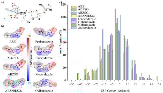 (a) The alignment of cross-reactive analytes with ABZ based on lowest energy conformations with all of the hydrogen atoms hidden. (b) Electrostatic potential energy of analytes. The negative potential areas are indicated in blue; red coloring indicates positive potential areas, and white indicates relatively neutral areas. The blue and golden globules on the surface represent the minima and maxima of ESP (kcal/mol) on the van der Waals surface. (c) The calculated surface area distribution in different ESP ranges on the van der Waals surface.