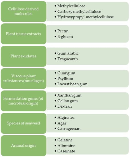 Hydrocolloids are classified according to their origin, as shown in Figure 1. Different types of hydrocolloids were used in GF products, including hydroxypropyl methylcellulose (HPMC), xanthan gum (XG), guar gum (GG), locust bean gum, psyllium, carrageenan, pectin, carboxymethyl cellulose (CMC), konjac gum, gelatine, agarose, agar, β-glucan, gum arabic (GA) and alginate [4,5,6].