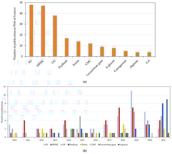 (a) Number of publications by name of the hydrocolloid in GF bread applications. (b) Number of publications by name of the hydrocolloid in GF bread applications over time (in the last 11 years). Results were obtained on 19 October 2021 on the Web of Science database.