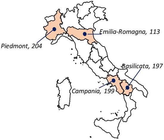 A total of 749 subjects (18–65 years, 420 females and 329 males), from four different Italian regions (197 from Basilicata, 199 from Campania, 113 from Emilia-Romagna, and 204 from Piedmont) participated in the study (Figure 1). Subjects were divided into three age groups (18–30; 31–45; 46–65 years). Data on the socio-demographic information and smoking habits (non-smoker; ex-smoker; current smoker) were collected. Subjects were also asked to declare how they judge their sense of smell (lower than normal/normal/higher than normal) and to state their weight (in kg) and height (in cm), from which their body mass index (WHO/Europe) was calculated.