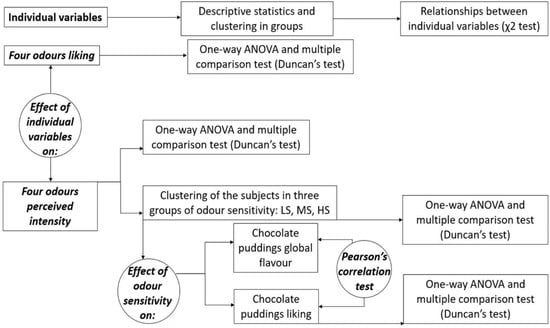 Individual variables related to gender, provenance, age, BMI, smoking habits, and self-reported smell were elaborated through descriptive statistics. The approaches used to treat the food neophobia data and the PROP status is explained in the previous paragraphs. To measure the odor sensitivity, considering that the anise odor collected fewer correct answers than the other three odorants, the recognition of anise was used as a factor for the subjects’ clustering into groups of odor sensitivity. Therefore, subjects were clustered in three groups of odor sensitivity, based on the perceived intensity of anise odor; subjects who did not recognize the odor were clustered in the low-odor-sensitivity group (LS). Then, using the median of the intensity scores as cut-off, subjects were clustered in the moderate-odor-sensitivity group (subjects with scores lower than the median value) and the high-odor-sensitivity group (subjects with a score higher than the median value). Relationships among the individual variables were explored by running chi-square tests. The differences between the four odors in terms of liking and perceived intensity were analyzed by one-way ANOVA and a multiple comparison test (Duncan’s test). The effect of individual variables on perceived intensity and liking of the four odors was tested by means of one-way ANOVA and a multiple comparison test (Duncan’s test). Repeated measures ANOVA and a multiple comparison test (Duncan’s test) were used to evaluate whether differences among the four chocolate puddings (used as a repeated factor) were statistically significant in terms of global flavor perception and liking. Pearson’s correlation was used to investigate the relationship between global flavor perception and liking scores of the four chocolate puddings. Finally, the three groups of odor sensitivity were used as fixed variables in repeated measures ANOVA models to explore their influence on global flavor perception and liking of the four chocolate puddings. The XLSTAT statistical software package version 2016.02 (Addinsoft) was used for data analysis. Significance was set for p values < 0.05.