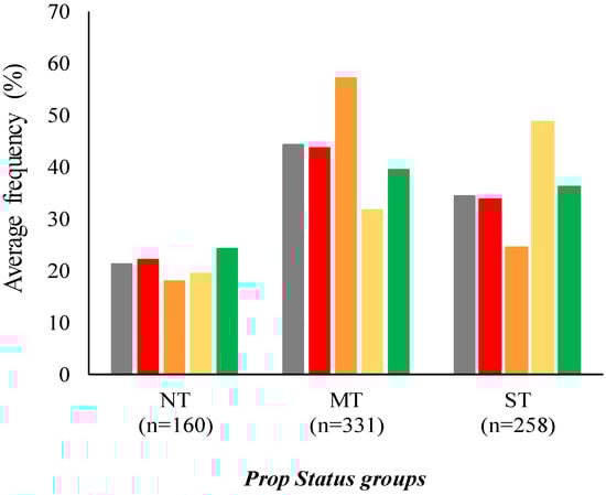 PROP taster status was assessed using a 3.2 mm PROP solution, prepared by dissolving 0.545 g/L of 6-n-propyl-2-thiouracil (Sigma-Aldrich, Burlington, MA, USA) into deionized water. Subjects rated the intensity of bitterness of two identical samples by using the generalized labelled magnitude scale (gLMS) [51]. Sample presentation and evaluation procedure were reported in Bartoshuk et al. [55]. PROP taster status of each subject was defined based on the average rating of the two replicates. Subjects were classified for responsiveness to PROP bitterness into three classes, applying previously used cut-off values [45], as follows: no-taster = NT (ratings on gLMS ≤ moderate, 17), medium-taster = MT (17 < ratings on gLMS < 53), and super-taster = ST (ratings on gLMS ≥ very strong, 53).