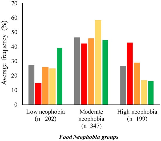 Average frequency (%) of food neophobia groups × provenance (■ All subjects (n = 749); ■ Basilicata, n = 197; ■ Campania, n = 199; ■ Emilia-Romagna, n = 113; ■ Piedmont, n = 240).