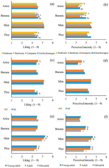 Therefore, considering the effect of the provenance (Figure 5a), the consumers from Emilia-Romagna and Basilicata liked the banana odor significantly more than the consumers from Piedmont and Campania (p = 0.001). On the other hand, the consumers from Piedmont and Emilia-Romagna liked the pine odor significantly more than the consumers from Basilicata and Campania (p = 0.002). The banana odor was perceived with higher intensity by the consumers from Piedmont and Emilia-Romagna than the consumers from Campania and Basilicata (p = 0.0001). Similarly, the consumers from Piedmont and Emilia-Romagna perceived the anise odor with higher intensity compared to the consumers from Campania and Basilicata (p = 0.014, Figure 5b).