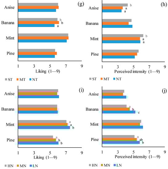 Finally, food neophobia significantly affected the liking of the mint and pine odors (Figure 5i). In particular, the mint-liking scores of the low-neophobia consumers were significantly higher than those given by the medium- and high-neophobia consumers (p = 0.023), while the pine-liking scores of the low- and medium-neophobia consumers were significantly higher than those given by the high-neophobia consumers (p = 0.007). Moreover, the intensity of the banana and pine odors perceived by the low-neophobia consumers was significantly lower than that perceived by the medium- and high-neophobia consumers (p < 0.05, Figure 5j).