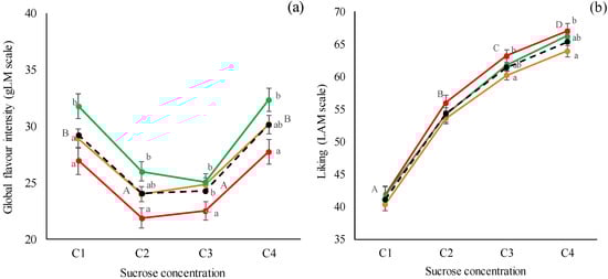 Effect of sucrose concentration (C1 = 38 g/kg; C2 = 83 g/kg; C3 = 119 g/kg; C4 = 233 g/kg) and odor sensitivity (LS, MS, HS) on: (a) global flavor intensity and (b) liking scores of chocolate pudding. LS = Low-odor-sensitivity (▬); MS = Moderate-odor-sensitivity (▬); HS = High-odor-sensitivity (▬); Average = all the subjects (▬ ▬); Different capital letters indicated significant differences among sucrose concentrations (within groups) (p ≤ 0.05); Different small letters indicated significant differences among odor-sensitivity groups (between groups) (p ≤ 0.05).