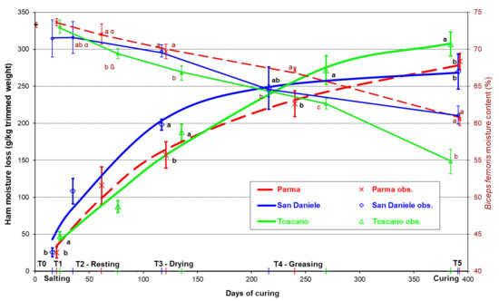 Evolution of the moisture loss in the whole ham and of the moisture content in the biceps femoris muscle during the processing of the main Italian prosciutto PDOs (obs. = observed mean with standard deviation values). Along the x–axis, the days from slaughtering of the various ripening phases of the three PDOs ham are also reported (a, b, c: differences between PDOs within a ripening phase p ≤ 0.05; α,β: differences between PDOs within the ripening phase p ≤ 0.10).