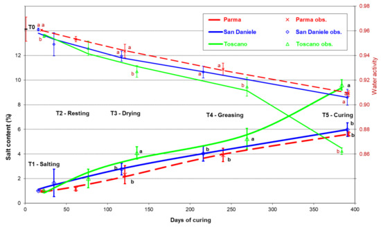 Evolution of the salt content and aw in the biceps femoris muscle during the processing of the main Italian prosciutto PDOs (obs. = observed mean with standard deviation values; a, b: differences between PDOs within the ripening phase p ≤ 0.05).