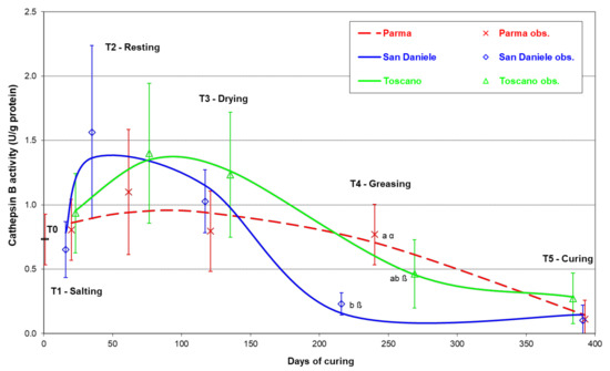 Evolution of the Cathepsin B activity in the biceps femoris muscle during the processing of the main Italian prosciutto PDOs (obs. = observed mean with standard deviation values; a, b: differences between PDOs within a ripening phase p ≤ 0.05; α, β: differences between PDOs within the ripening phase p ≤ 0.10).