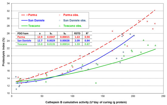 Relationship between proteolysis index (PI) and Cathepsin B cumulative activity (CBc) of Parma, San Daniele and Toscano PDO hams measured at five processing phases: individual observed values, obs., and second order polynomial regression lines, PI = a + b1 CBc + b2 CBc2. In table, regression coefficients (a, b1 and b2), residual standard deviation (RSTD), and coefficient of determination (R2) of each PDO curve are reported.