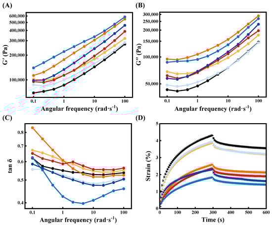 Mechanical spectra and creep-recovery curves of frozen dough. (A) G′, (B) G′′, and (C) tan δ versus frequency. (D) The creep-recovery curves.