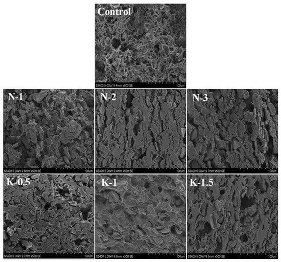 As revealed in Figure 2, many voids were observed for the control, which might be related to the sublimation of the ice crystals forming voids in the noodles, while a looser gluten network also caused starch granules to fall off, thus creating voids [,]. With the addition of NaCl and kansui, more starch granules were embedded well in the cross-section and the gluten network was more continuous, suggesting that the strengthened gluten network could capture the starch firmly. As NaCl levels increased from 1% to 2%, the gluten network changed from less-connected protein particles to an elongated fibrous protein network with stronger adhesion of starch granules. When NaCl was added over 2%, a few loosely rounded starch granules surrounded by a less dense protein network was observed. This might be explained by the fact that at low levels (<2%), NaCl shielded the charges of the gluten protein, which promoted the slow hydration of the flour and created a more orderly network. Nevertheless, at high levels of NaCl (>2%), excessive shielding and repulsion occurred, with the NaCl preferring to bind to water, a fact that is detrimental to the hydration of gluten proteins [,].