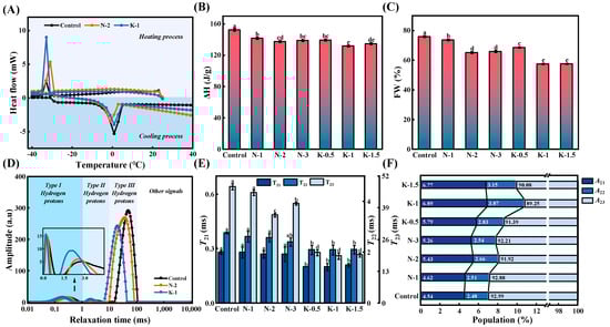 Water distribution of the frozen cooked noodles. (A) Freezing and melting curves. The (B) melting enthalpy (ΔH) and (C) freezable water content (FW) of frozen cooked noodles. (D) The typical T2 relaxation time distribution curve. The (E) relaxation times and (F) peak area proportions of frozen cooked noodles. Different letters in the same bar chart represent significant differences (p < 0.05).