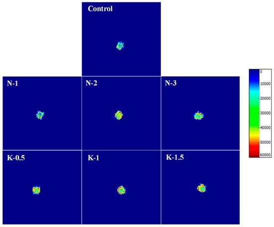 As illustrated in Figure 4, the addition of NaCl and kansui could induce lower water mobility and excellent water retention in FCNs. As NaCl and kansui were increasing, the red areas occupied most of the cross section gradually and the green areas were distributed evenly, indicating that the addition of NaCl and kansui had an inhibitory effect on water migration and dehydration. Especially for the 2% NaCl and 1% kansui groups, a well-integrated circle of high hydration might be noticed on the outside and the water penetrated gradually from the surface to the interior of the cooked noodles. This suggested that suitable additions of NaCl and kansui could promote the formation of a coherent gluten network []. The red area of Figure 4 (K-1) appeared to be higher than that of (N-2), showing that 1% kansui provided the dough with the best water retention performance. Furthermore, alkaline noodles exhibited a large difference in water content between the surface and the center, with a higher moisture gradient, which could contribute to a firm texture of FCNs.