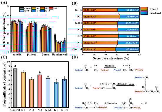 Structural properties of gluten protein. (A) Relative proportion of secondary structure. (B) Breakdown of ordered and unordered structures in gluten protein. (C) The free sulfhydryl content of frozen dough. (D) Overview of some common reactions in or between amino acid chains which are enhanced by alkaline conditions. Different letters in the same bar chart represent significant differences (p < 0.05).