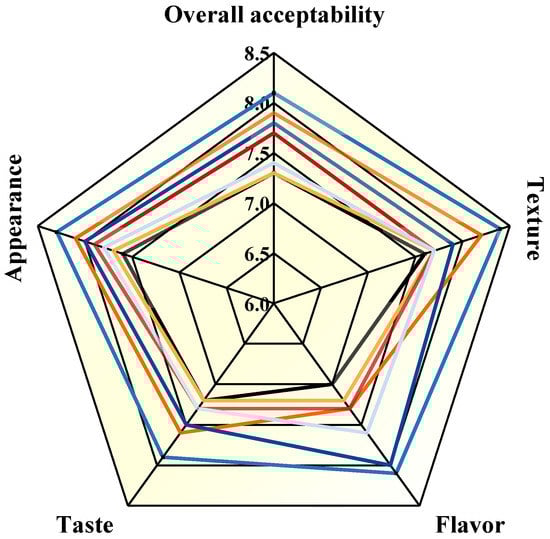 As shown in Figure 6, as the levels of NaCl and kansui increased, the improvement effect on the organoleptic properties of noodles became more significant. In particular, noodles with 1% kansui had the best sensory scores in terms of appearance, taste, flavor, texture, and overall acceptability, indicating that consumers preferred noodles with a firm texture and high chewiness. The cooked noodles with kansui in the formulation had enhanced aroma compared to the NaCl, indicating that kansui could impart a more desirable flavor to FCNs. This might be related to the fact that kansui could inhibit the formation of non-aroma flavor compounds caused by fat oxidation by adjusting the pH of the dough []. Moreover, the addition of 2% NaCl improved the appearance, taste, texture, and overall acceptability of the noodles markedly, which could be explained by the appropriate levels of NaCl induced the superiority in dough extensibility and recovery ability.