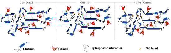 A model to explain the mechanism whereby NaCl and kansui affect gluten proteins network formation after freezing was proposed in Figure 7. Previous studies confirmed that frozen storage mainly led to the disaggregation of protein aggregates by destroying the disulfide cross-links between gluten proteins []. In our study, 1% kansui induced more stable intermolecular disulfide bonding in the dough during freezing, which contributed to the more complete gluten structure and stronger water retention capacity of FCNs. Kansui could induce stronger hydrophobic interactions between gluten proteins compared to NaCl has also been confirmed []. In summary, NaCl and kansui exerted different effects on the stability of the gluten network structure of FCNs after freezing. Kansui stimulated the conversion of free sulfhydryl groups to disulfide bonds obviously, generating denser crosslinks based on the original network. Thus, a greater mechanical force was required to break the alkaline dough. In contrast, NaCl tended to enhance the original gluten network structure, but contributed to the extensibility of the frozen dough, which could also explain the difference in quality of the recooked FCNs.