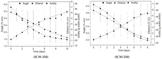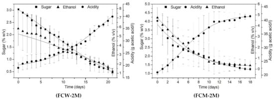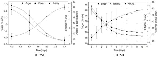 - Dias, D.R.; Silva, M.S.; De Souza, A.C.; Magalhães-Guedes, K.T.; de Rezende Ribeiro, F.S.; Schwan, R.F. Vinegar Production from Jabuticaba Fruits (Myrciaria jaboticaba) Using Immobilized Acetic Acid Bacteria. Food Technol. Biotechnol. 2016, 54, 351–359. [Google Scholar] [CrossRef] [PubMed]