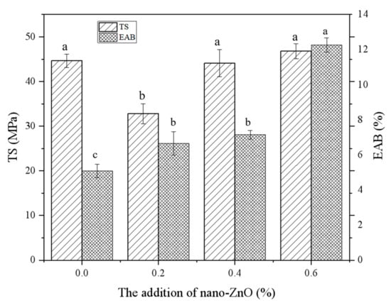 Effect of addition of nano-ZnO on mechanical properties. Different letters in the column indicate significant differences (p < 0.05).