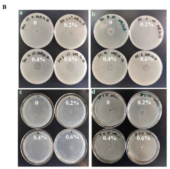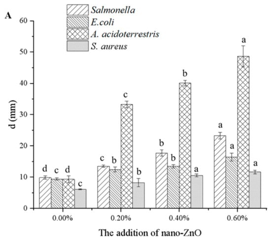 The inhibition zone diameter in different strains (A) and the inhibition zone of composite membranes (B) under different nano-ZnO contents (0, 0.2%, 0.4%, 0.6%). Lowercase letters in (A) indicate the significant differences in different strain (p < 0.05). a, b, c and d represent the strains of Salmonella, E. coli, A. acidoterrestris and S. aureus, respectively, in (B).