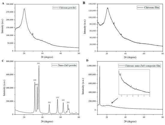 The XRD patterns of chitosan powder (A), chitosan film (B), nano-ZnO powder (C) and chitosan composite film with 0.6% nano-ZnO (D).