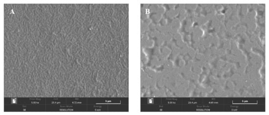SEM images of the pure chitosan and composite (0.6% nano-ZnO) films showed different surface morphologies. The pure chitosan film had a uniform surface and texture (Figure 4A), whereas the smoothness of the composite film surface disappeared because of nano-ZnO accumulating and dispersed over the surface of chitosan (Figure 4B). These results suggested that the two polymer materials were compatible, and the film structure was changed by the addition of nano-ZnO. Qiu et al. reported that there were uniform ZnO protrusions in the composite films due to the fixation effect from the interaction between chitosan and Zn2+ [28]. Additionally, the addition of nano-ZnO has been reported to interfere with the molecular structure of chitosan, and to affect its mechanical properties, leading to slight changes to its surface morphology [29]. The addition of nano-ZnO may improve the mechanical strength of films due to the formation of electrostatic bonds between chitosan and ZnO particles that cause the film surface to be rough [30].