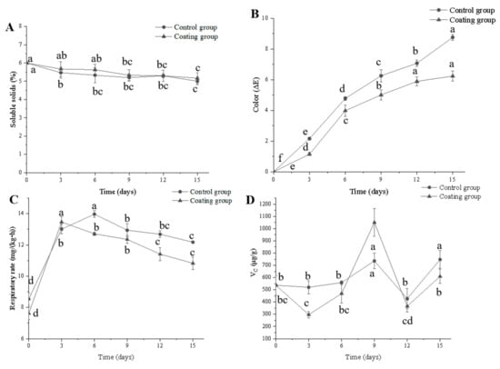 Changes in soluble solids (A), color (B), respiratory intensity (C) and ascorbic acid content (D) of cherry tomatoes during storage by different treatments. Different letters indicate significant differences (p < 0.05).