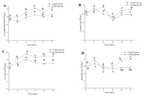 Changes in the concentration of A. acidoterrestris (A), S.aureus (B), E.coli (C) and Salmonella (D) of cherry tomatoes during storage by different treatments. Different letters indicate significant differences (p < 0.05).