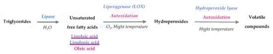Different classes of volatiles, such as aromatic hydrocarbons, aldehydes, alcohols, alkanes, ketones (furans) and esters, are mostly derived from enzymatic or nonenzymatic oxidation (autoxidation) of free fatty acids. Although pulses have a low fat content (0.8–7% of seed weight), this mechanism is dominant and strongly contributes to unpleasant odours, such as herbal, green, pea, beany, mould, and rancid notes []. The synthesis of these compounds follows three phases (Figure 1).