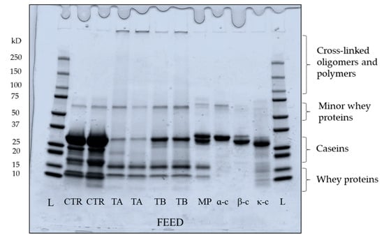 Protein profile of feed and permeate samples was qualitatively assessed using sodium dodecyl sulphate–polyacrylamide gel electrophoresis (SDS-PAGE) with precast gels (Mini-PROTEAN TGX, Bio-Rad Laboratories, Irvine, CA, USA) under reducing conditions using an AcquaTank mini gel unit (Acquascience, Bellbrook Industrial Estate, Uckfield, UK) []. The final protein concentration of feed for loading was 1 mg/mL and permeate was used as it came; feed and permeate volumes of 5 and 15 µL were loaded onto the gels. Along with samples, 5 µL of each αs-casein, β-casein and κ-casein protein standard and low heat skim milk powder of 1 mg/mL concentration were also loaded. All gels were Coomassie-stained and were scanned using a desktop scanner (HP Scanjet G4010, HP, Leixlip, Ireland).