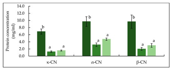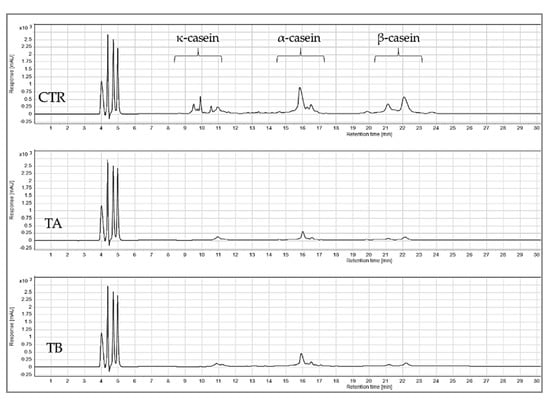 The RP-HPLC chromatograms in Figure 2 shows the peaks identified for κ-, αs- and β-casein, while no peaks were visible for whey proteins due to their concentration being below the detection limit. []. Based on the quantification of identified peaks (Figure 3), both TA and TB feeds had significantly (p < 0.05) lower concentrations of κ-, αs- and β-casein compared to CTR feed. Between the two treatments no significant (p > 0.05) difference was observed in the concentrations of κ-, αs- or β-casein.