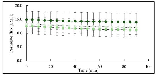 CTR, TA and TB feeds were analysed for total nitrogen using the Kjeldahl method with a nitrogen-to-protein conversion factor of 6.38 []. Ash content was determined by dry ashing in a muffle furnace at 500 °C for 5 h []. Total solids were measured by oven drying at 103 °C for 5 h. The pH of the feed samples was measured immediately before MF filtration and for the permeate samples just after 90 min filtration cycle using a pH meter (bench pH meter, model HI2211-02, Hanna Instruments Ltd., Bedfordshire, UK) at 25 ± 1 °C. The colour of feed samples (15 mL) was measured using a chromameter CR-400 (Konica Minolta Sensing, Inc, Osaka, Japan) using CIELAB coordinates (L*, a*, b*). The feed samples were maintained at 5 °C before duplicate analysis. The chromameter was calibrated before the measurement using a white tile. In the CIELAB system, L* value corresponds to the brightness and the values can vary between 0 (black) and 100 (white), a* value measures degree of redness (positive values) or greenness (negative values), and b* value measures degree of yellowness (positive values) or blueness (negative values).