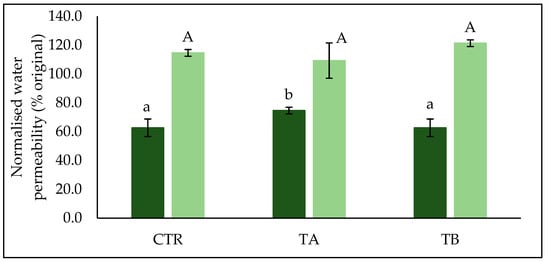 Normalised water permeability (% original value) of membrane measured before (■) and after (■) membrane cleaning process. Values are the means ± standard deviations of analysis from triplicate runs at each treatment. Different lowercase and uppercase letters on the bar graphs indicate significant differences (p < 0.05).