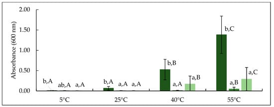 Absorbance at 600 nm of CTR, TA and TB permeate samples incubated at 5, 25, 40 and 55 °C. CTR: no enzyme treatment (■); TA: 5 °C/24 h (■); TB: 40 °C/90 min (■). Different lowercase letters indicate significant differences (p < 0.05) between treatment. Different uppercase letters represent significant differences (p < 0.05) between incubation temperature.
