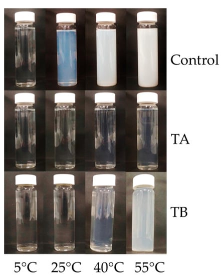 The development of turbidity in permeate was studied as an indication of β-casein concentration and its linked temperature dependent aggregation behaviour as influenced by mTG treatment. The absorbance of permeate produced from CTR, TA and TB feed was measured at 5, 25, 40 and 55 °C, as shown in Figure 6 and visual appearance of turbidity development is revealed in Figure 7. The absorbance of CTR increased significantly (p < 0.05) on increasing temperature from 25 to 55 °C. For TA and TB permeates, no significant (p > 0.05) increase in turbidity was observed up to 40 °C, while it increased significantly (p < 0.05) thereafter. On comparing CTR and treatments, at any given temperature, CTR permeate had significantly (p < 0.05) higher absorbance than TA and TB, while it was comparable (p > 0.05) between TA and TB. β-casein has a distinct temperature-dependent transition between micellar and monomeric states []; at low temperature (5−10 °C), β-casein generally exists in its monomeric form with size of approximately 8 nm []. With increasing temperature (>25 °C), β-casein can form micelle type structures with a hydrophobic core and a soft permeable exterior, with diameter up to 1 µm at 50 °C [], resulting in high turbidity, as also observed in CTR permeate (Figure 7). In TA permeate, the turbidity remained visibly very low, suggesting that the proportion of monomeric β-casein was very low. On the other hand, when TB permeate was heated to 40 or 55 °C, the turbidity development was observed, which indicates the presence of monomeric β-casein that had ability to self-associate into aggregates on heating.